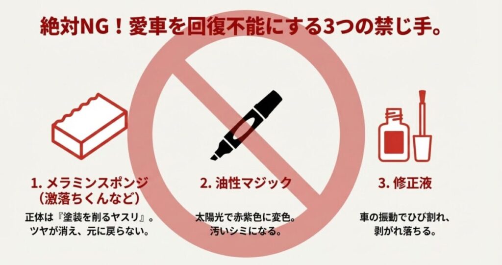 • デメリット: 効果は一時的。雨に濡れたり、洗車機に通したりすると油分が流出し、魔法が解けたように元の傷が復活する。