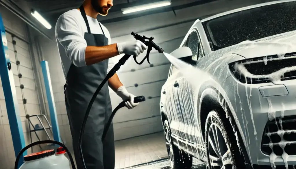 次に、油分や虫汚れなどの有機汚れを分解するため、アルカリ性シャンプーを車体全体に噴霧します。フォームガンやスプレーヤーを使うと、均一に塗布できて効率的です。噴霧後、シャンプーが汚れに反応するまで3分ほど時間を置きます。この待機時間が、化学の力で汚れを浮かせるための重要なポイントです。
