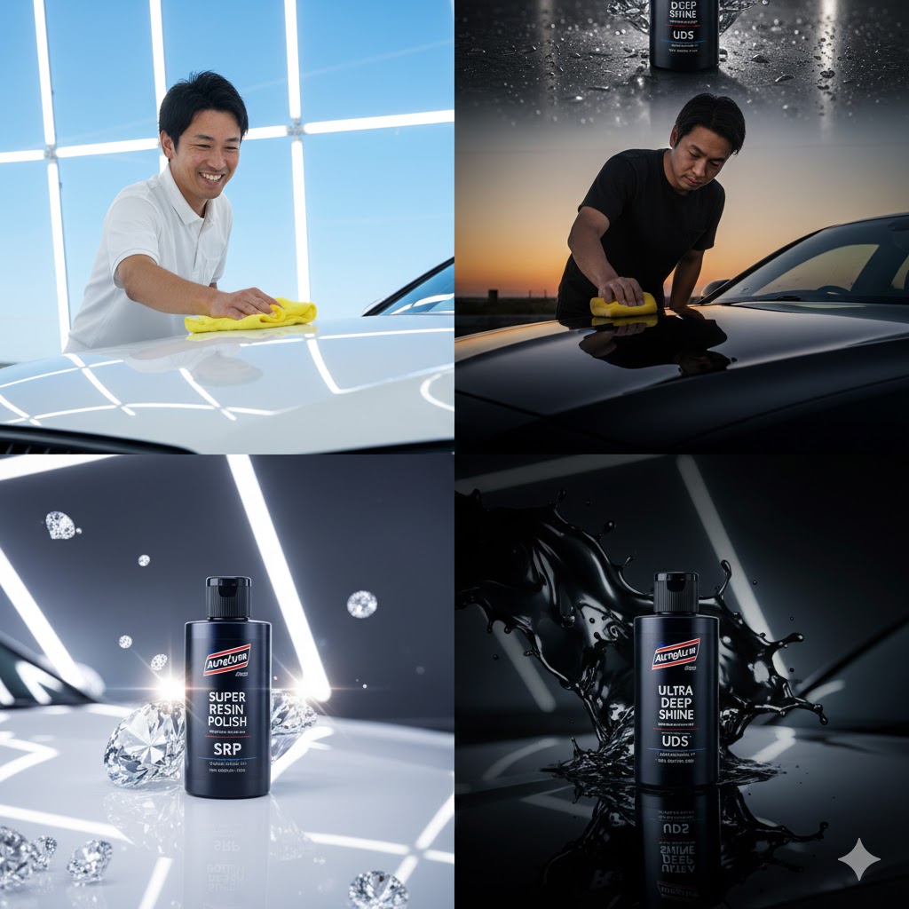 まず、もしあなたの車がシルバー、ホワイト、ベージュなどの淡色車であれば、迷わず「SRP(スーパー・レジン・ポリッシュ)」を選んでください。UDSの深い艶効果は淡色車では視覚的に分かりにくく、作業が重くなるデメリットの方が大きくなってしまうからです。