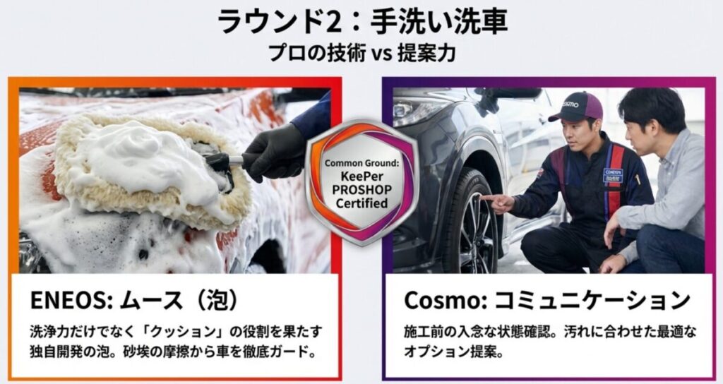 コスモ石油における手洗い洗車も、非常にクオリティが高いことで知られています。エネオスと同様にキーパーの確かな技術を取り入れている店舗も多く、物理的な技術の差はほとんどありません。特筆すべきは、コスモ石油の現場スタッフによる施工前の入念な状態確認とコミュニケーション能力の高さです。