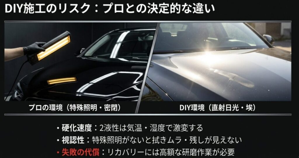 DIYが絶対に不可能というわけではありませんが、拭きムラや硬化ムラ、プロのような照明設備がないことによる拭き残しといったリスクがかなり高いです。プロの現場では、微細な傷やコーティングの塗りムラを見逃さないための特殊な照明が完備されていますが、一般のガレージや屋外でそれを再現するのは困難です。