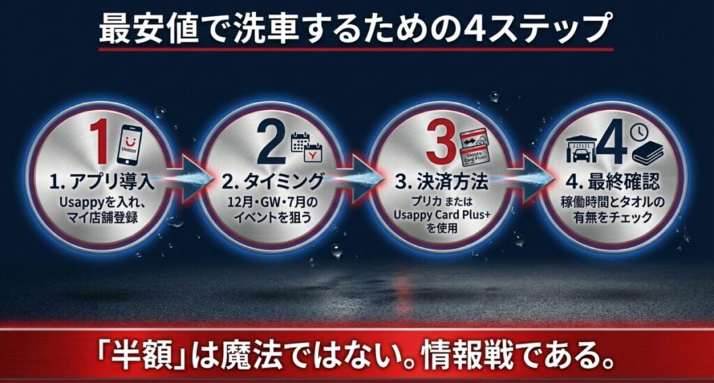 結論として、「宇佐美の洗車は半額になるのか?」という問いに対する答えは、「可能性はあるが、常時半額ではない」というのが正確な実態です。いつでも半額で洗える魔法のような方法は存在しませんが、情報を知っているかいないかで、年間数千円の差が出ることは間違いありません。