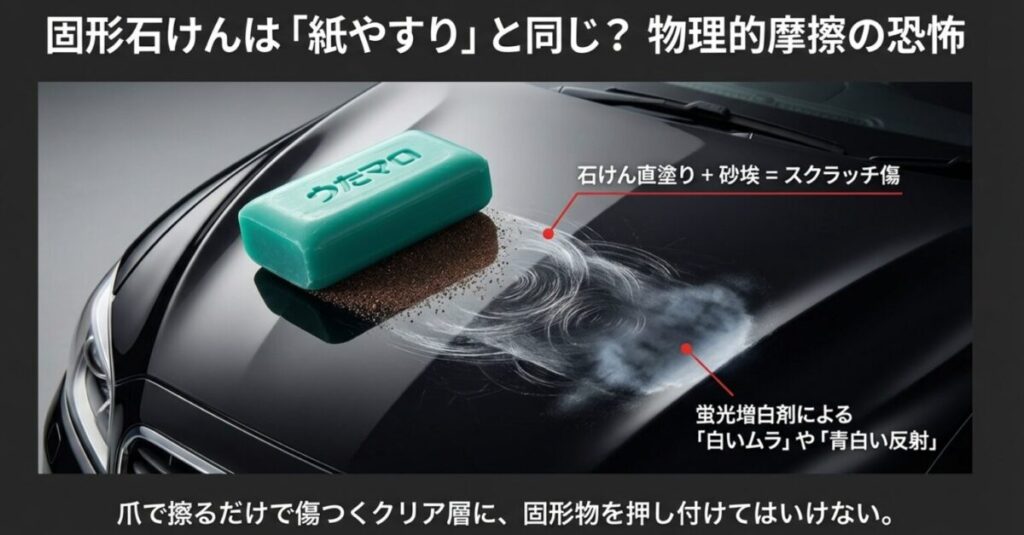 最大のリスクは、成分云々の前に「物理的な摩擦」です。固形石けんを車に使う場合、スポンジに石けんを擦り付けるか、あるいは石けんを直接ボディに当てることになります。