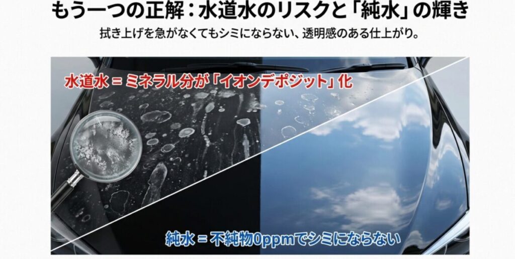 洗剤選び以上に、洗車の仕上がりを左右するのが「水」の質です。実は、洗車における最大の敵は、水道水に含まれる「ミネラル分(カルシウム、マグネシウム、シリカなど)」です。