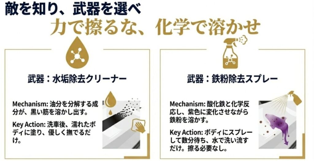 • 汚れは溜めない! 黒い筋や鉄粉は「落ちなくなる前」にケミカルで瞬殺する。