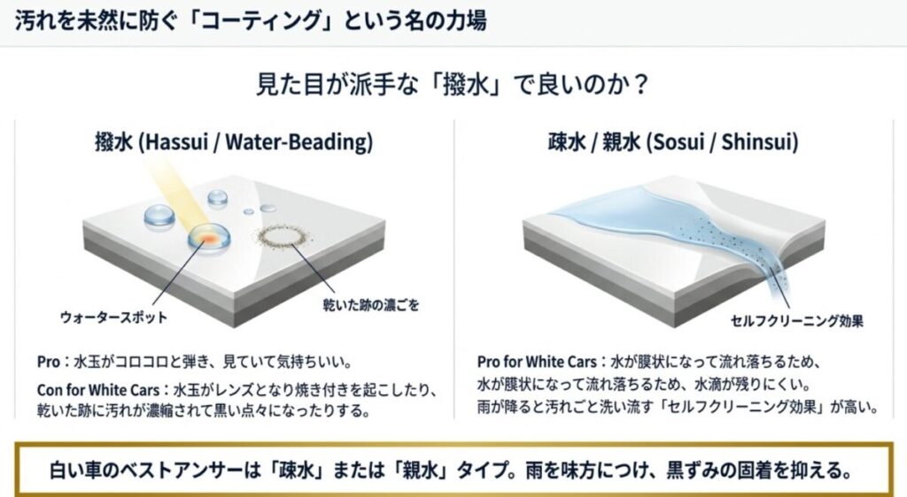 白い車へのベストアンサーは? 私は断然、「疎水」または「親水」タイプをおすすめします。白い車はウォータースポット(凹み)自体は見えにくいのですが、水滴が乾いた跡に含まれる汚れが「黒ずみ」の原因になります。 撥水タイプでできた水玉が乾燥すると、そこに空気中の汚れが濃縮されて残り、黒い点々になります。疎水や親水タイプなら、雨が降れば汚れごと洗い流してくれる「セルフクリーニング効果」が高いため、バーコード汚れや黒ずみの固着を最小限に抑えることができるのです。